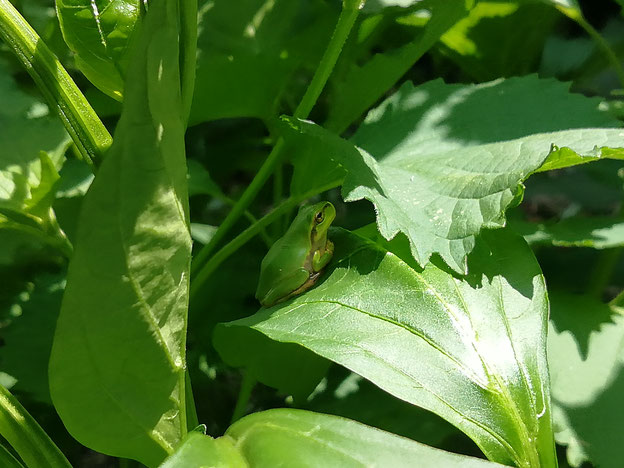 カエル番長が葉の陰にいました